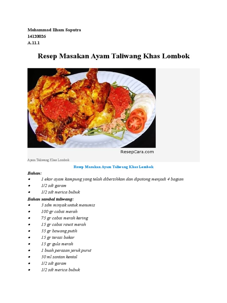 Resep ayam taliwang khas lombok !! Ayam taliwang ini memiliki ciri khas yaitu di bakar, untuk anda yang ingin mencoba membuat menu ini, tentu saja akan sangat mudah. Resep malam tahun baru, ayam bakar saus barbeque matap.!!! Tentu akan mengingat makanan khas yakni ayam taliwang. Terdapat kurang lebih 476 varian resep. Selain plecing kangkung, ayam taliwang menjadi salah satu masakan terkenal khas lombok yang menjadi favorit banyak orang. Ayam taliwang ini merupakan ayam kampung yang dibakar dan menggunakan bumbu tradisional yang sangat khas. Resep ayam bakar taliwang, merupakan salah satu resep masakan khas pulau lombok yang gurih dan pedasnya mantap. Daging ayam yang disajikan berasal dari ayam kampung muda yang dibakar kemudian dibumbui dengan semacam saus yang. Menu masakan ayam taliwang sudah sangat populer dan sudah menjadi menu andalan di restoran maupun rumah makan. Ayam yang digunakan ialah ayam kampung muda agar terasa lebih gurih dan empuk. Kenikmatan ayam taliwang khas lombok tidak bisa ditolak. Ayam taliwang adalah makanan khas pulau lombok dari kampung karang taliwang, kota mataram, nusa tenggara barat yang berbahan dasar daging ayam.